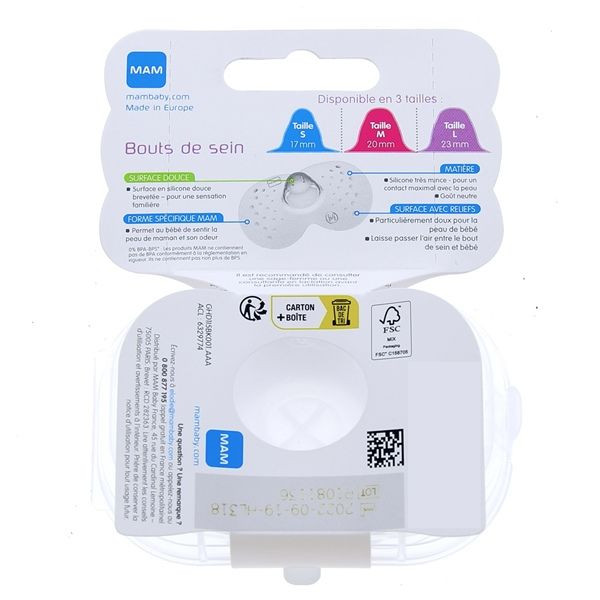 Les bouts de seins de la marque MAM sont destinés à être utilisés par les mamans allaitantes, mais dont les mamelons sont douloureux. Fabriqués en silicone, ces bouts de seins ont été créés de manière à permettre aux petits bouts de chou de pouvoir sentir l'odeur et la peau de leur maman pendant l'allaitement. Minces et particulièrement doux, les bouts de seins de la marque MAM favorisent le contact mère-enfant. Ils laissent en outre, passer l'air entre bébés et le bout du sein.