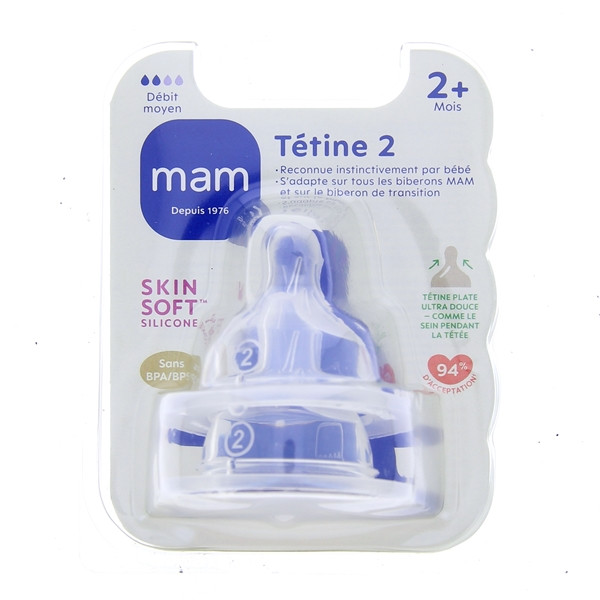 Les Tétines MAM à débit moyen (2) proposées par les laboratoires MAM sont conçues spécialement pour les bébés à partir de 2 mois et plus. Elles ont l'avantage d'avoir une surface souple très similaire aux tétons et offrant ainsi des sensations identiques au sein maternel. Grâce à leurs valves, elles s'adaptent idéalement à la fréquence des tétées. Elles sont dotées d'une forme symétrique adaptée à la physionomie de la bouche assurant une mise en place efficace. Les Tétines MAM à débit moyen peuvent être utilisées à la fois pour donner une infusion à bébé ou pour donner le lait.