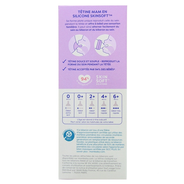 Sa tétine de débit moyen en silicone ultra-douce comme la peau de la maman permet au bébé de 2 mois et plus de reconnaitre la tétine instinctivement. De plus sa forme plate reproduit la forme du mamelon pendant la tétée.