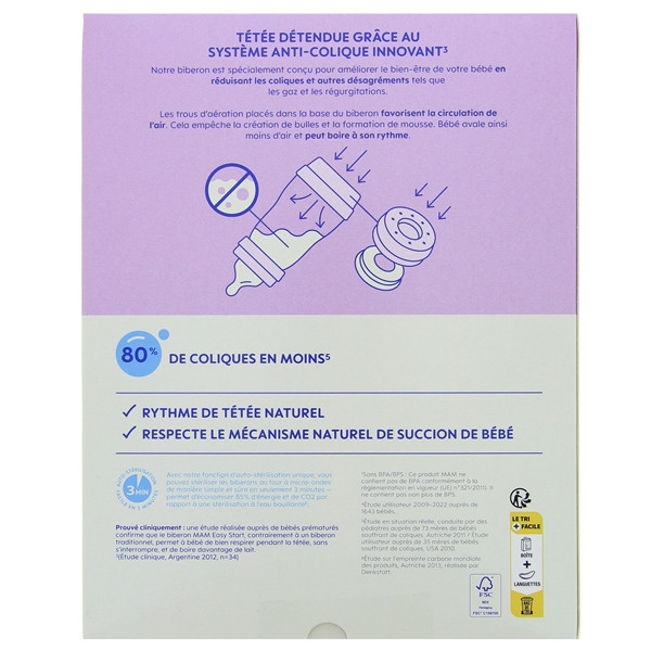 Les biberons Easy Start Anti-colique avec une tétine de débit moyen en silicone de la marque MAM offre un système anti-colique innovant. Il convient aux bébés de 2 mois et plus.