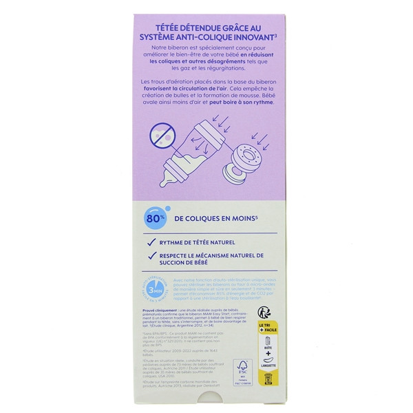 Bio, Easy Start Biberon Anti-Colique Débit Rapide Lila 320 ml MAM est conçu pour le bonheur des bébés et celui des mamans. Ayant une contenance de 320 ml, il est pratique et facile à ranger. Il n’a pas besoin d’un lavage intensif ou d’accessoires de nettoyage. Ce biberon est doté d’une fonction d’autostérilisation. Les parents ont le choix entre plusieurs couleurs et motifs.