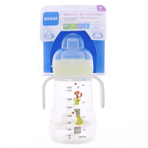 Le biberon de transition blanc avec une capacité de 220 ml de la marque MAM est idéal pour aider bébé dans son évolution. Il permettra à bébé d'apprendre à boire comme un grand facilement.
