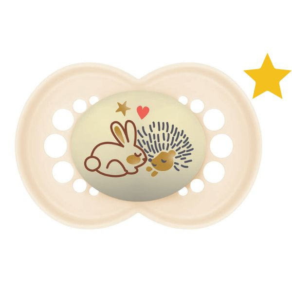 La marque MAM vous propose 2 sucettes jour et 1 sucette nuit en silicone ultra doux qui respectent la forme de la bouche des enfants de 18 mois et plus. La sucette nuit brille dans la nuit pour la retrouver facilement.