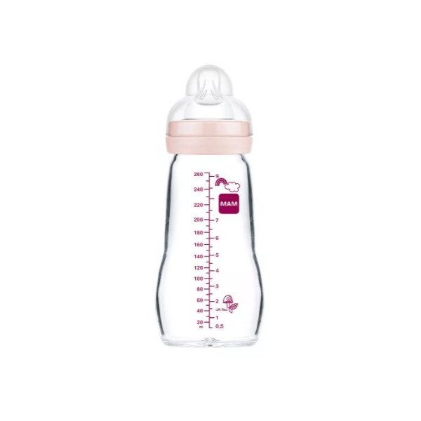 Le MAM Biberon en verre de 260 ml Rose avec une tétine débit 2 est destiné aux bébés de 2 mois et plus.