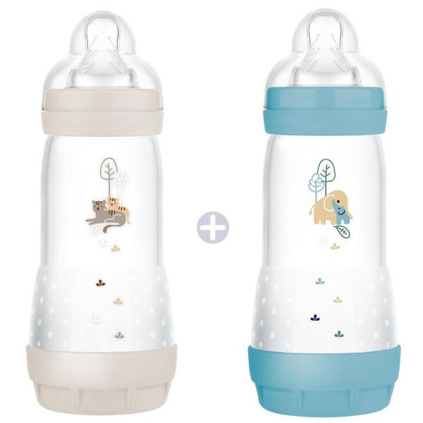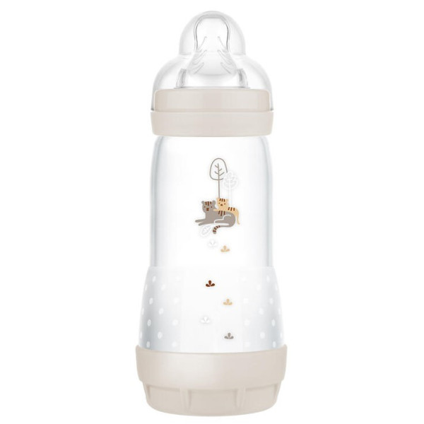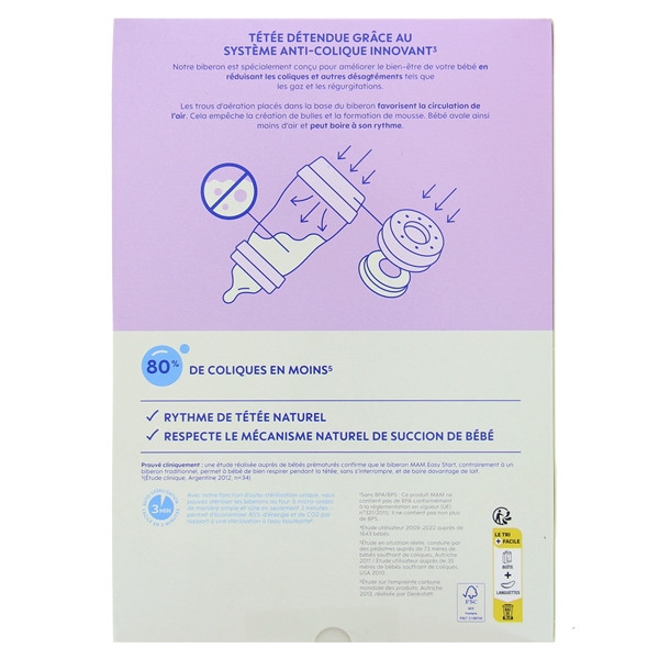 Le Biberon Easy Start Anti-Colique 320 ml Tétine de débit rapide proposé par la marque MAM est idéal pour faciliter l'alimentation des bébés de 4 mois et plus.