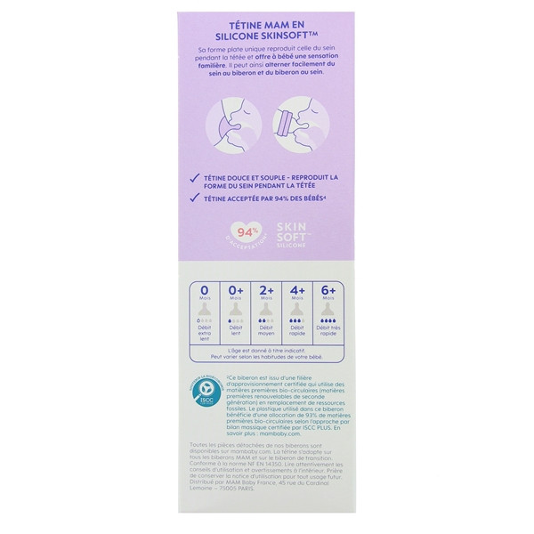 Avec le biberon Anti-colique MAM comprenant une tétine débit rapide en silicone ultra-doux comme la peau de la maman et plate comme la forme du téton lors de la tétée, votre bébé acceptera très facilement de boire au biberon.