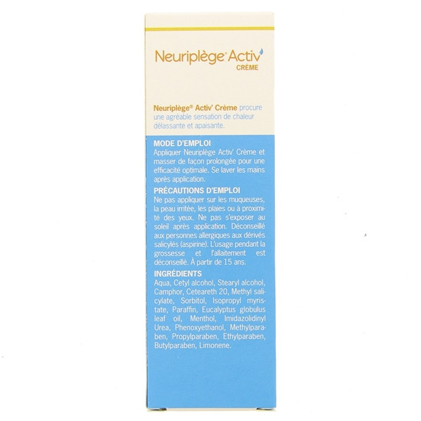 À base de camphre, d'eucalyptol et de menthol, la crème Neuriplège Activ apporte un effet chaud sur la zone douloureuse. La crème chauffante Neuriplège Activ est idéale pour les muscles endoloris ou les courbatures.