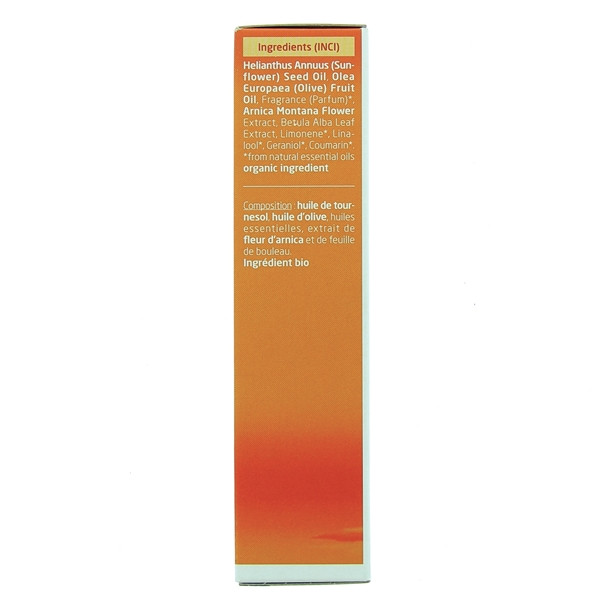 Huile de tournesol*, Huile d'olive*, Huiles essentielles, Extrait de fleur d'arnica* et de feuille de bouleau.