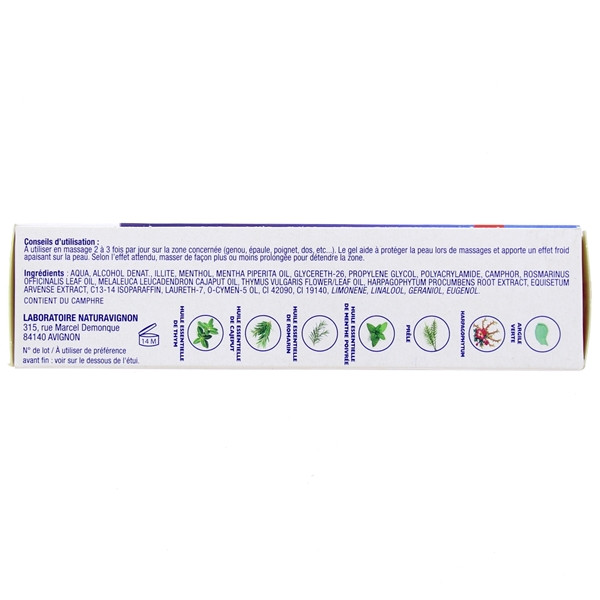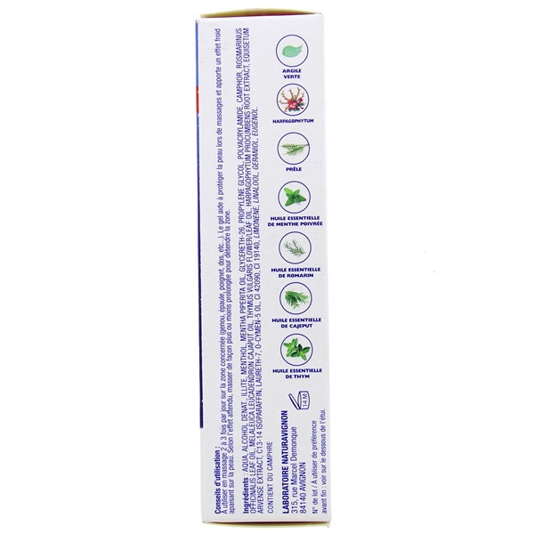 Aqua, alcohol denat., illite, menthol, mentha piperita oil, glycereth-26, propylene glycol, polyacrylamide, camphor, rosmarinus officinalis leaf oil, melaleuca leucadendron cajaput oil, thymus vulgaris flower/leaf oil, harpagophytum procumbens extract, equisetum arvense extract, c13-14 isoparaffin, laureth-7, o-cymen-5-ol, ci 42,090, ci 19,140, limonene, linalool, geraniol, eugenol.