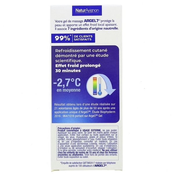Argel 7 est un gel de massage Expert double action formulé à base de 7 ingrédients d'origine naturelle. Ce gel permet d'apaiser les zones concernées par un effet froid immédiat et prolongé.