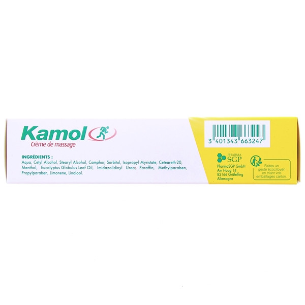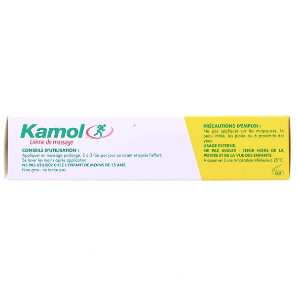 La crème de massage chauffante Kamol, proposée en tube de 100 g renferme des actifs antalgiques et chauffants afin de soulager la gêne articulaire et musculaire lors de contractures, faux mouvements ou courbatures. Il s'agit d'un soin complet favorisant l'assouplissement des muscles grâce à l'action des huiles essentielles, du salycilate de methyle et du capsicum. Cette crème chauffante, réalisée dans une texture non grasse et fluide, s'applique en massage prolongé avant et après un effort physique.