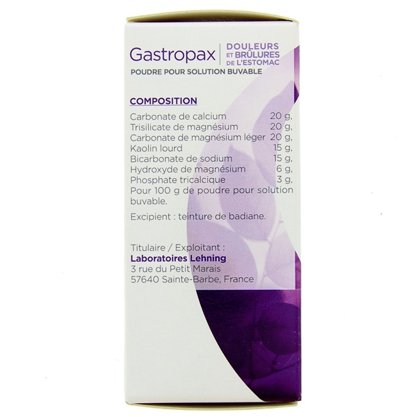 Gastropax Douleurs et brûlures de l'estomac est un médicament homéopathique sous forme de poudre pour solution buvable. Gastropax est indiqué en cas de douleurs et brûlures de l'œsophage ou dans les douleurs, les brûlures et les aigreurs de l'estomac chez l'adulte.