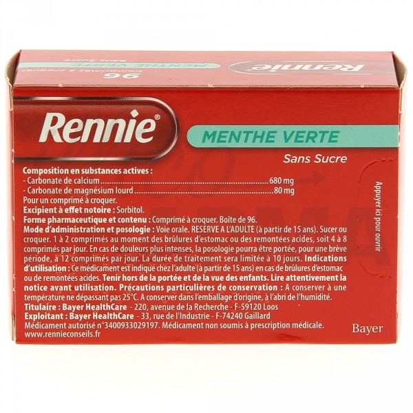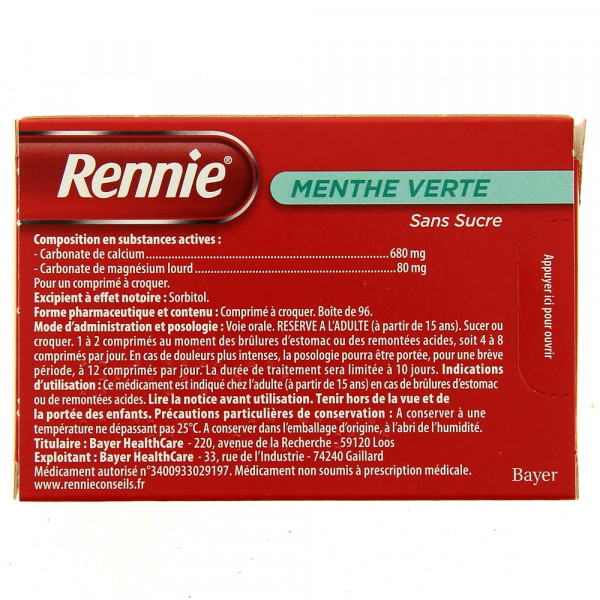 Rennie Menthe verte est disponible en boîte de 96 comprimés à croquer sur notre e-pharmacie. La consultation de la notice est indispensable avant tout achat en ligne du médicament Rennie. Rennie est notamment indiqué en cas de brûlures d'estomac. Les comprimés de Rennie ont un goût Menthe verte et sont sans sucre.