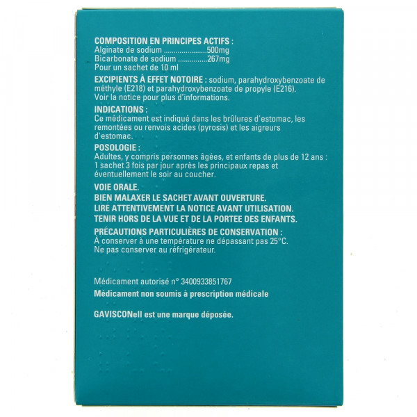 Gavisconell est un médicament accessible sans prescription médicale et pouvant donc être acheté dans les pharmacies en ligne. Ce médicament agit sur les brûlures d'estomac et les remontées acides. Gavisconell est disponible sous forme de suspension buvable en boîte de 24 sachets-dose au goût Menthe sans sucre.
