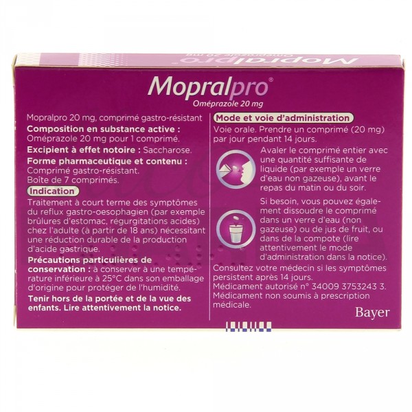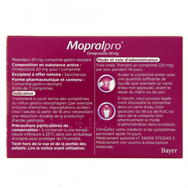 MopralPro est un médicament indiqué dans le cadre du reflux gastro-oesophagien (RSO) : brûlures d'estomac, maux d'estomac. La persistance des symptômes nécessite une consultation médicale. Lire attentivement la notice avant tout achat en ligne de MopralPro. MopralPro est disponible en boîte de 7 comprimés.