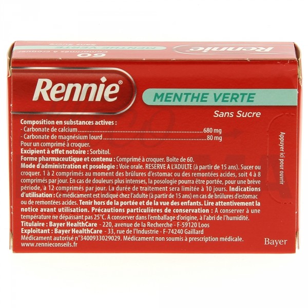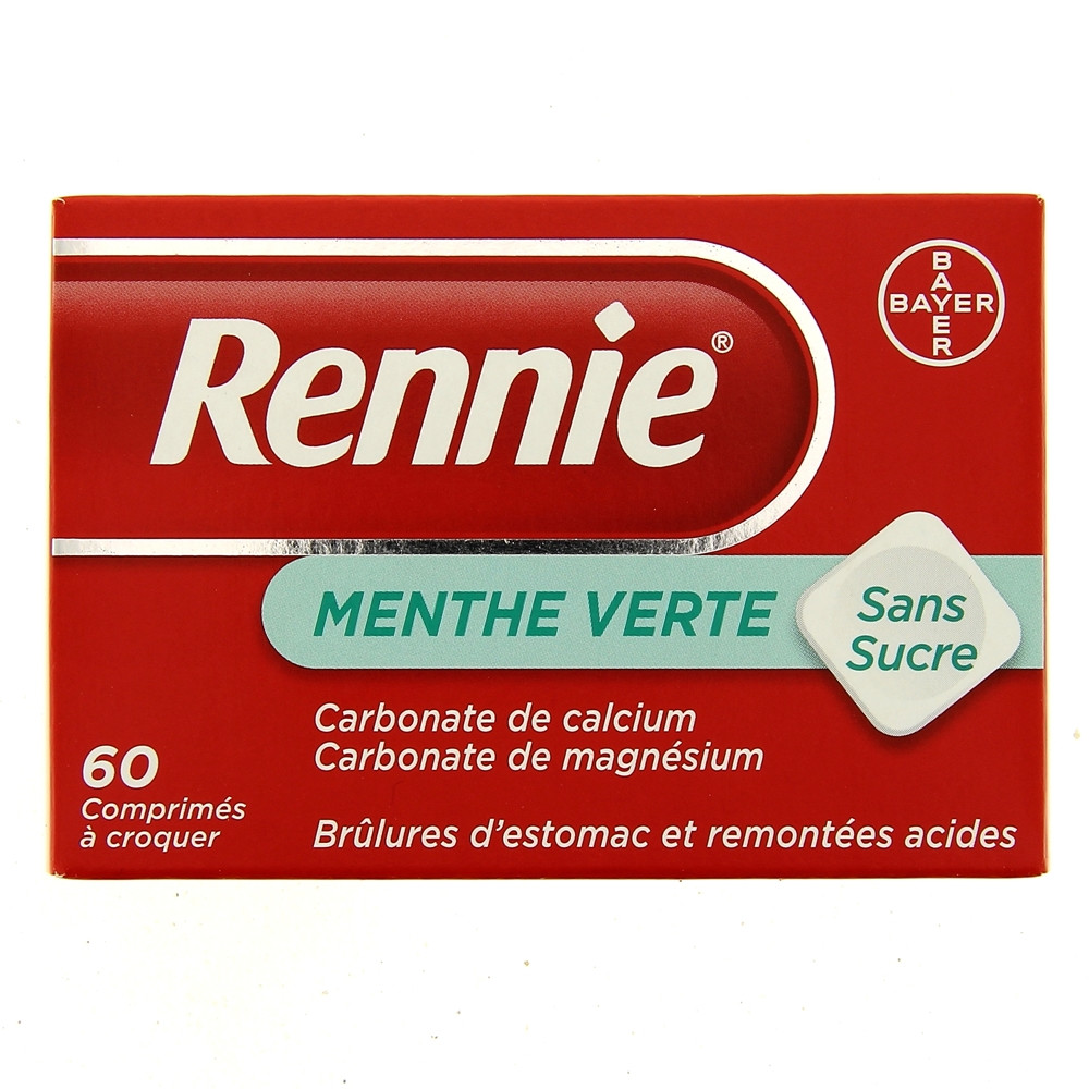 Le médicament Rennie ne nécessite pas d'ordonnance pour pouvoir être acheté sur internet. Rennie est indiqué pour lutter contre les brûlures d'estomac et les remontées acides. Rennie est un médicament disponible en boîte de 60 comprimés à croquer. Les comprimés de Rennie ont un goût Menthe verte et sont sans sucre.