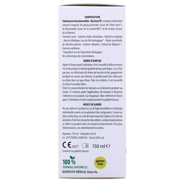 Resinox FP , complexe moléculaire végétal de polysaccharides ( d'Aloe vera * et Altea * ), flavonoïdes ( de Camomille * ) et résines ( de Myrrhe ).