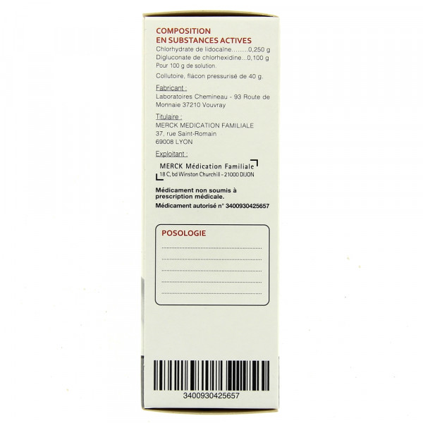 Ce collutoire contient un antiseptique (chlorhexidine) qui a un effet antibactérien et un anesthésique local (lidocaïne) qui a un effet antalgique.