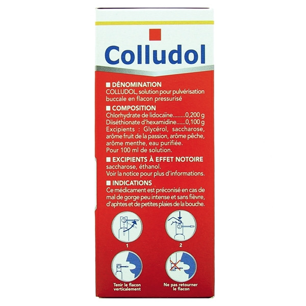 Le médicament Colludol Maux de gorge est disponible en flacon pulvérisateur de 30 ml.