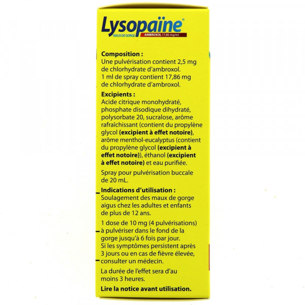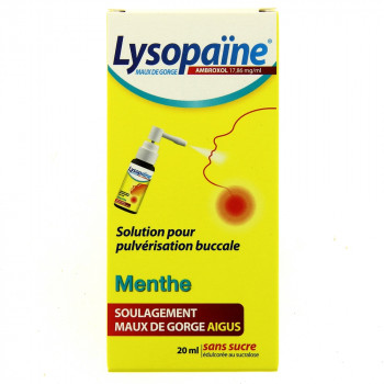 Lysopaïne à base d'ambroxol est disponible sous forme de collutoire au parfum Menthe. Cette solution pour pulvérisation buccale soulage les maux de gorge aigus. Lysopaïne est un médicament sans ordonnance et apporte un soulagement d'au moins 3 heures. Lysopaïne Menthe en collutoire est formulé sans sucre et est disponible en flacon de 20ml.