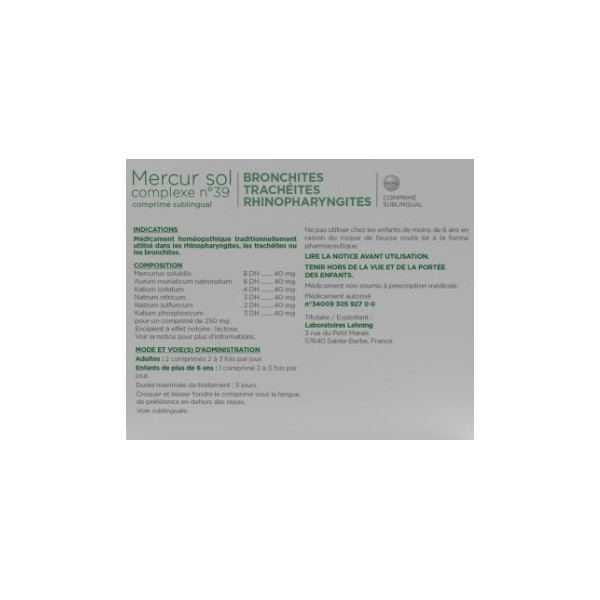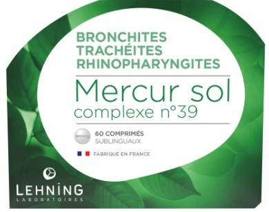 Le complexe Mercur Sol n°39 des laboratoires homéopathiques Lehning est destiné aux traitements des rhinopharyngites, Trachéites et Bronchites.
