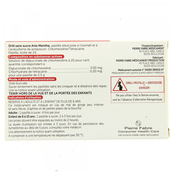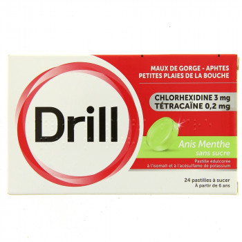 Pour soigner un mal de gorge, notre pharmacie en ligne vous propose le médicament Drill. Sans sucre et au goût Anis Menthe, le médicament Drill est disponible en boîte de 24 pastilles à sucer. La consultation de la notice est nécessaire avant tout achat de Drill en ligne sur notre e-pharmacie. Drill de nécessite pas d'ordonnance mais au-delà de 5 jours, l'avis d'un médecin est nécessaire.