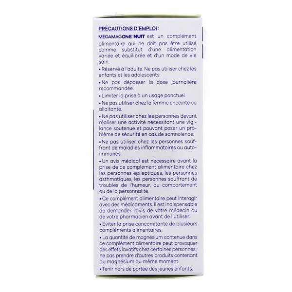 Megamagone Nuit est un complément alimentaire formulé à base de magnésium, mélatonine, mélisse et camomille. Il est indiqué pour faciliter l'endormissement et favoriser un sommeil sain & réparateur.