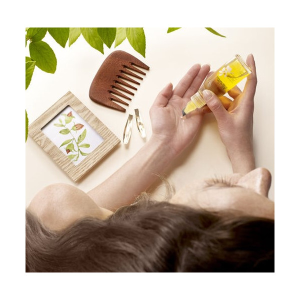 - Pour les cheveux, étaler l’huile sur les longueurs et pointes avant le shampooing, toujours avec les mains. Attendre 15 minutes avant de rincer.
