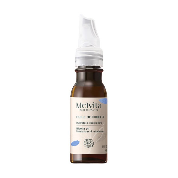 Melvita Huile de Nigelle Bio est extraite par pression à froid des graines de nigella sativa (nigelle), une plante aussi connue sous le nom de cumin noir. Ces graines possèdent des vertus purifiantes et leur huile exerce des actions antiseptiques et anti-inflammatoires pour atténuer les apparences des imperfections cutanées, telles que les boutons, les points noirs, les zones de brillance. Ce produit renforce les défenses naturelles de la peau et rétablit son équilibre en cas d’excès de sébum. Il détient également des propriétés hydratantes et régénérantes qui accélèrent la cicatrisation des marques laissées par les acnés. Cette huile est aussi bénéfique pour la chevelure. Elle apaise les irritations du cuir chevelu et hydrate sans alourdir les cheveux gras. Sa formule vegan est exempte de colorant artificiel. Conditionnement : flacon pompe 50ml.