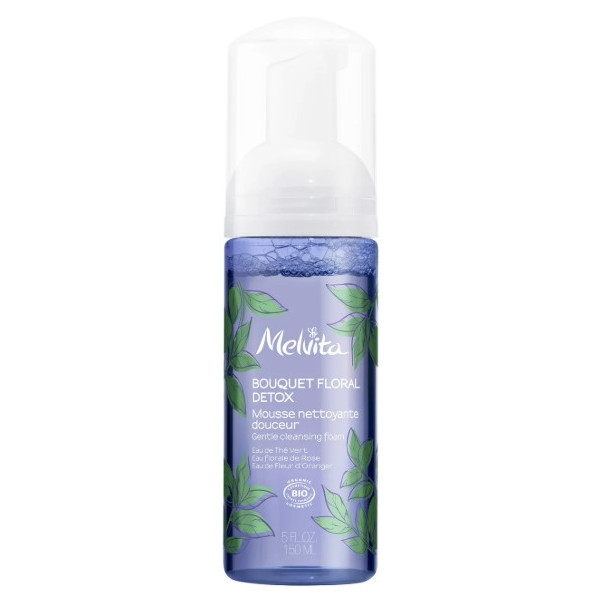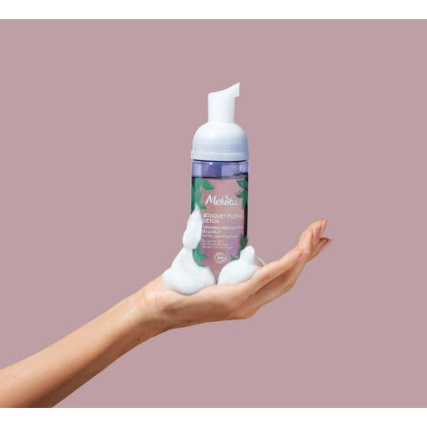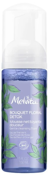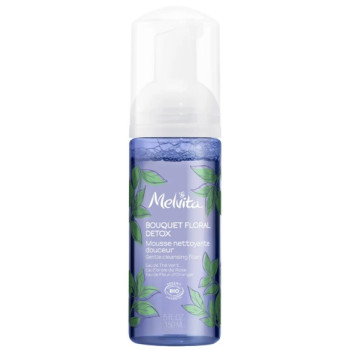 Bouquet Floral Detox Mousse Nettoyante Douceur Bio de la marque Melvita nettoie, élimine les impuretés et démaquille la peau tout en préservant son équilibre. Cette mousse à la texture onctueuse et aérienne ne contient pas de savon.