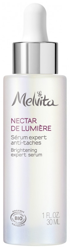 Nectar de Lumière Sérum Expert Anti-Taches Bio de la marque Melvita est un soin enrichi en vitamine C pour tous les types de peaux. Il corrige, estompe et aide à limiter l'apparition de tous les types de taches.