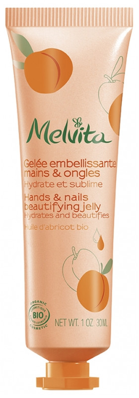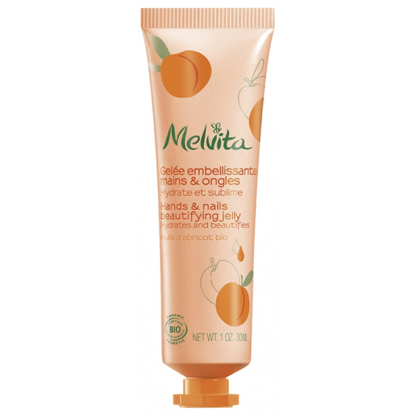 La Gelée Embellissante Mains & Ongles Abricot Bio de la marque Melvita est enrichie en huile d'abricot et huile de ricin bio pour hydrater et redonner de l'éclat à la peau des mains et renforcer les ongles.