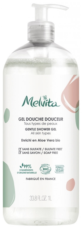 Le Gel Douche Douceur Bio de la marque Melvita, enrichi en aloe vera bio du Mexique, nettoie la peau en douceur tout en la préservant. Il convient à tous les types de peaux.