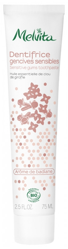 Le Dentifrice Gencives Sensibles Bio de la marque Melvita possède une formule vegan, certifié bio et sans fluor. Il nettoie en douceur les dents tout en apaisant les gencives irritées.