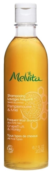 Le Shampooing Lavages Fréquents Bio à l'huile essentielle de pamplemousse et au miel de fleurs de la marque Melvita convient à tous les types de cheveux. Ce shampooing, sans agent moussant sulfaté, nettoie en douceur et apporte de la brillance aux cheveux.
