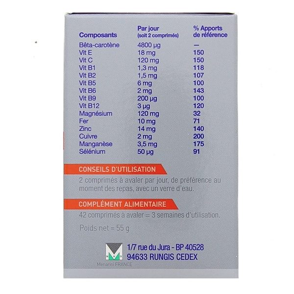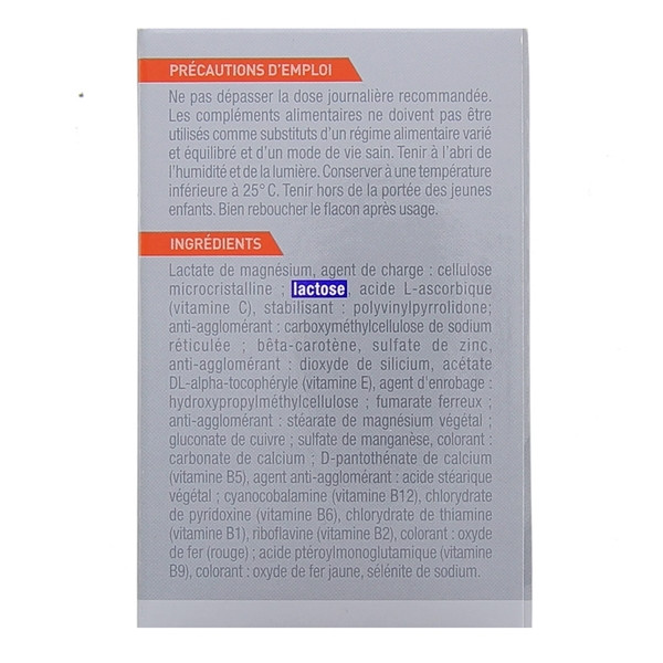 Lactate de magnésium, agent de charge : cellulose microcristalline, lactose, stabilisants : polyvinylpyrrolidone, carboxyméthylcellulose sodique réticulée, acide L-ascorbique (vitamine C), agent d’enrobage : hydroxypropylméthylcellulose, anti-agglomérants : dioxyde de silicium, stéarate de magnésium végétal, acide stéarique végétal, bêta-carotène, sulfate de zinc, acétate de DL-alpha-tocophérol (vitamine E), fumarate de fer, gluconate de cuivre, sulfate de manganèse, colorants : dioxyde de titane, rouge allura, D-pantothénate de calcium (vitamine B5), cyanocobalamine (vitamine B12), chlorhydrate de pyridoxine (vitamine B6), chlorhydrate de thiamine (vitamine B1), riboflavine (vitamine B2), acide ptéroylmonoglutamique (vitamine B9), sélénite de sodium.