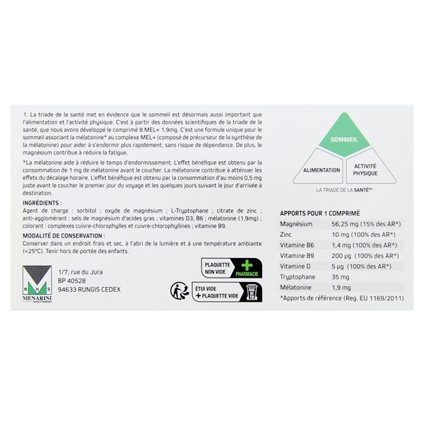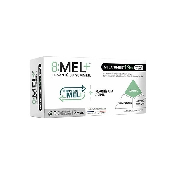 8:Mel + Mélatonine 1,9 mg est un complément alimentaire formulé avec 1,9 mg de mélatonine, du magnésium et du zinc dans le but de réduire le temps d'endormissement et d'atténuer les effets du décalage horaire.