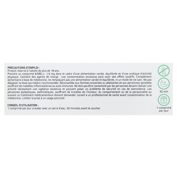 Pour favoriser un repos nocturne de qualité, avalez un comprimé de 8:Mel + Mélatonine 1,9 mg avec un verre d’eau, environ une demi-heure avant de vous coucher. Ce complément doit s’intégrer à un mode de vie saine, comprenant une alimentation équilibrée et des activités physiques régulières. Prenez soin d’utiliser ce produit de façon ponctuelle.