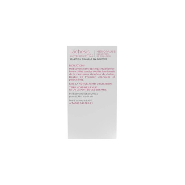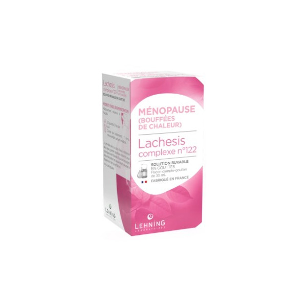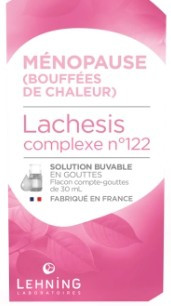 La solution buvable en gouttes Lachesis complexe n°122 des laboratoires Lehning est indiqué pour les troubles de la ménopause comme les bouffées de chaleur.
