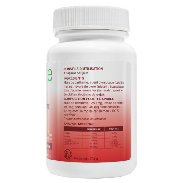 Ingrédients: huile de carthame, levure de bière, épaississant (cire d’abeille jaune), fer (fumarate), spiruline, émulsifiant (lécithine de soja), capsule de gélatine marine.