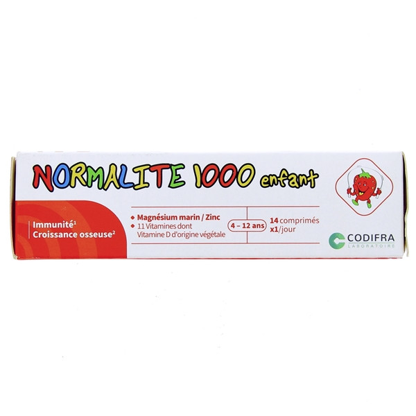 Normalite 1000 est un complément alimentaire pour enfant proposé par le laboratoire Codifra. Enrichi en vitamine D, ce complément alimentaire soutient la croissance ainsi que le développement normal de l'ossature des enfants. Le complément alimentaire bénéficie d'une formule contenant également de la vitamine C, spécialement extraite de l'acérola, de la vitamine E et du magnésium, d'origine marine. Agréablement parfumé à la fraise, ce complément alimentaire ne contient aucune trace d'aspartame. Il se présente sous la forme d'un comprimé sécable, non enrobé.