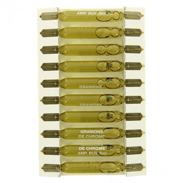 Les études cliniques les plus récentes démontrent l'efficacité du Chrome dans la régulation du métabolisme des glucides et des lipides au dosage de 200 μg par jour. Spécialiste des oligo-éléments, le Laboratoire des GRANIONS® a mis au point Granions® de chrome 200 μg/j (2 ampoules de 100 μg par jour), répondant ainsi aux nouvelles avancées scientifiques.