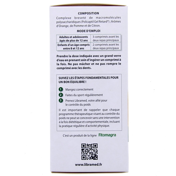 Associé à un régime équilibré, un apport adéquat de liquides et une activité physique régulière, Libramed, grâce à son mécanisme d'action, est indiqué pour le contrôle du poids chez les adultes et les enfants à partir de 8 ans.