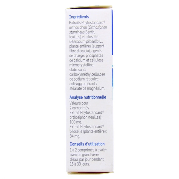 Extraits d’orthosiphon (Orthosiphon stamineus Benth, feuilles) et de piloselle (Hieracium pilosella L., plante entière) (support : fibre d’acacia), agents de charge: phosphates de calcium et cellulose microcristalline, stabilisant: carboxyméthylcellulose sodique réticulée, antiagglomérant: stéarate de magnésium.