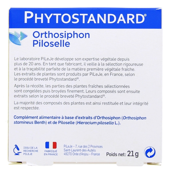 Phytostandard Orthosiphon Piloselle du laboratoire Pileje est un complément alimentaire formulé à base d'extraits d'orthosiphon et de piloselle connus pour leurs propriétés diurétiques.