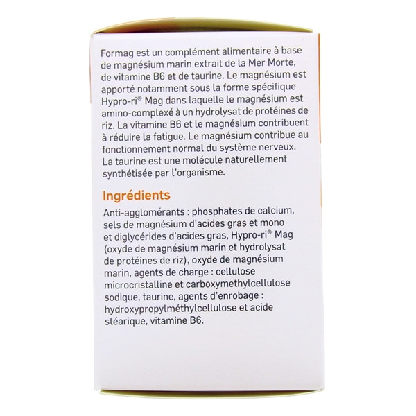 Dans sa gamme de compléments alimentaires, le laboratoire Pileje propose Formag. Ce complément alimentaire est spécialement formulé à partir d'un composé spécifique, l'Hyprori®mag, une association de fractions d'acides aminés et de magnésium d'eau de mer. Enrichi également en vitamine B6, le complément alimentaire Formag aide à réduire la fatigue. Les actifs agissent en synergie pour aider le complément alimentaire à favoriser la détente et à garantir l'activité normale du système nerveux. Grâce au magnésium, le complément alimentaire Formag favorise également une fonction musculaire normale.