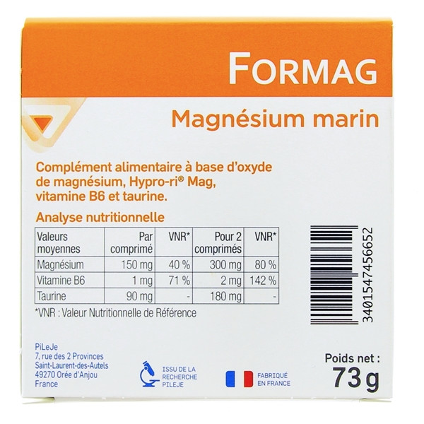 Formag Magnésium Marin du laboratoire Pileje est un complément alimentaire formulé à base d'oxyde de magnésium, d'Hypro ri® Mag, de vitamine B6 et de taurine pour garantir le bon déroulement des activités du système nerveux et réduire la fatigue.