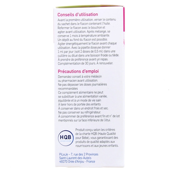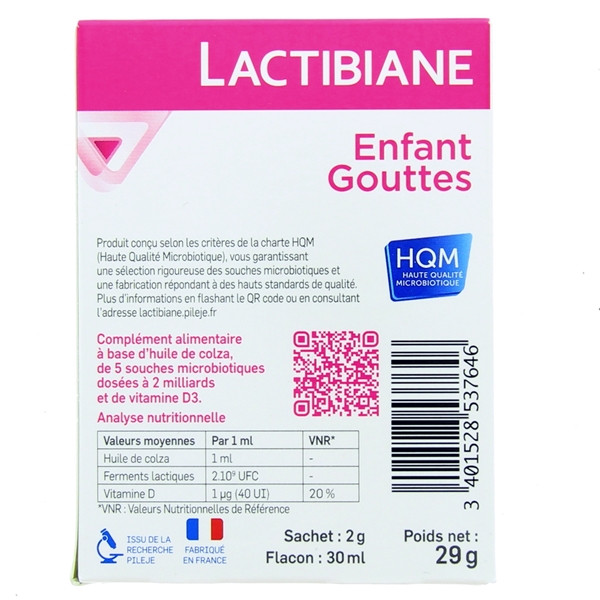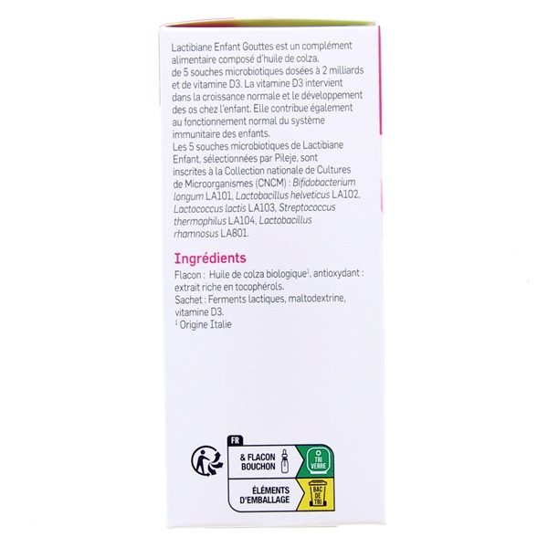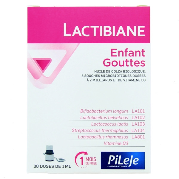 Lactibiane Enfant Gouttes est un complément alimentaire composé d’huile de colza biologique, de 5 souches microbiotiques dosées à 2 milliards et de vitamine D3.