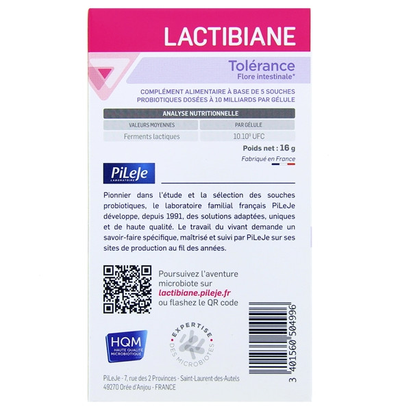 Grâce à un mélange de 5 souches probiotiques, le complément alimentaire Lactibiane Tolérance de Pileje permet de rééquilibrer la flore intestinale pour une meilleure tolérance alimentaire.