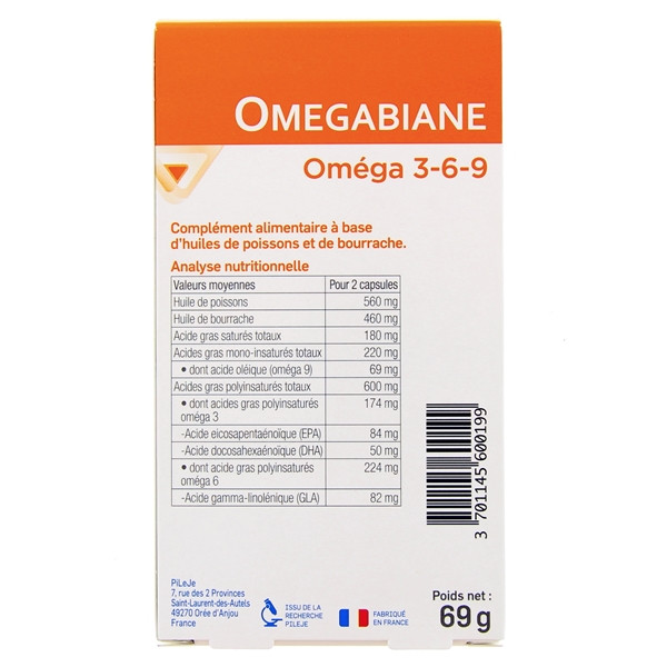 De la famille des compléments alimentaires, l’Omegabiane Oméga 3, 6 et 9 a le pouvoir d'équilibrer ou de compléter les apports en acides gras insaturés. Il se caractérise sa formulation enrichie d’acides gras omégas 3,6 et 9 fournis par l’huile de bourrache et l’huile de poisson capelan qu’elle renferme. Il fournit une complémentation compte tenu du fait que le corps n’a pas la capacité de synthétiser ces acides gras essentiels alors que ceux-ci sont indispensables à sa bonne santé.